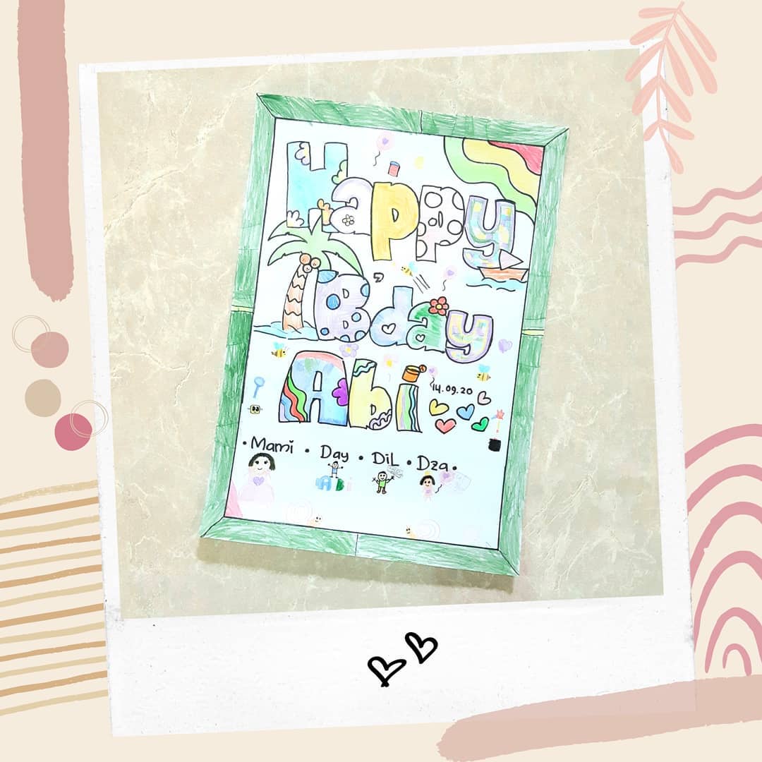 After the school was over, I whispered ideas to the kids. Hey, let’s create something special for Abi! It doesn’t have to be pro-artist good, it just have to be heartfelt. I took an A3 drawing paper and drew the pictures. The kids were excited. Dza said, “Kok tumben Mami bolehin kita nggak tidur siang.” Ahahaha you had your wish come true, didn’t you?