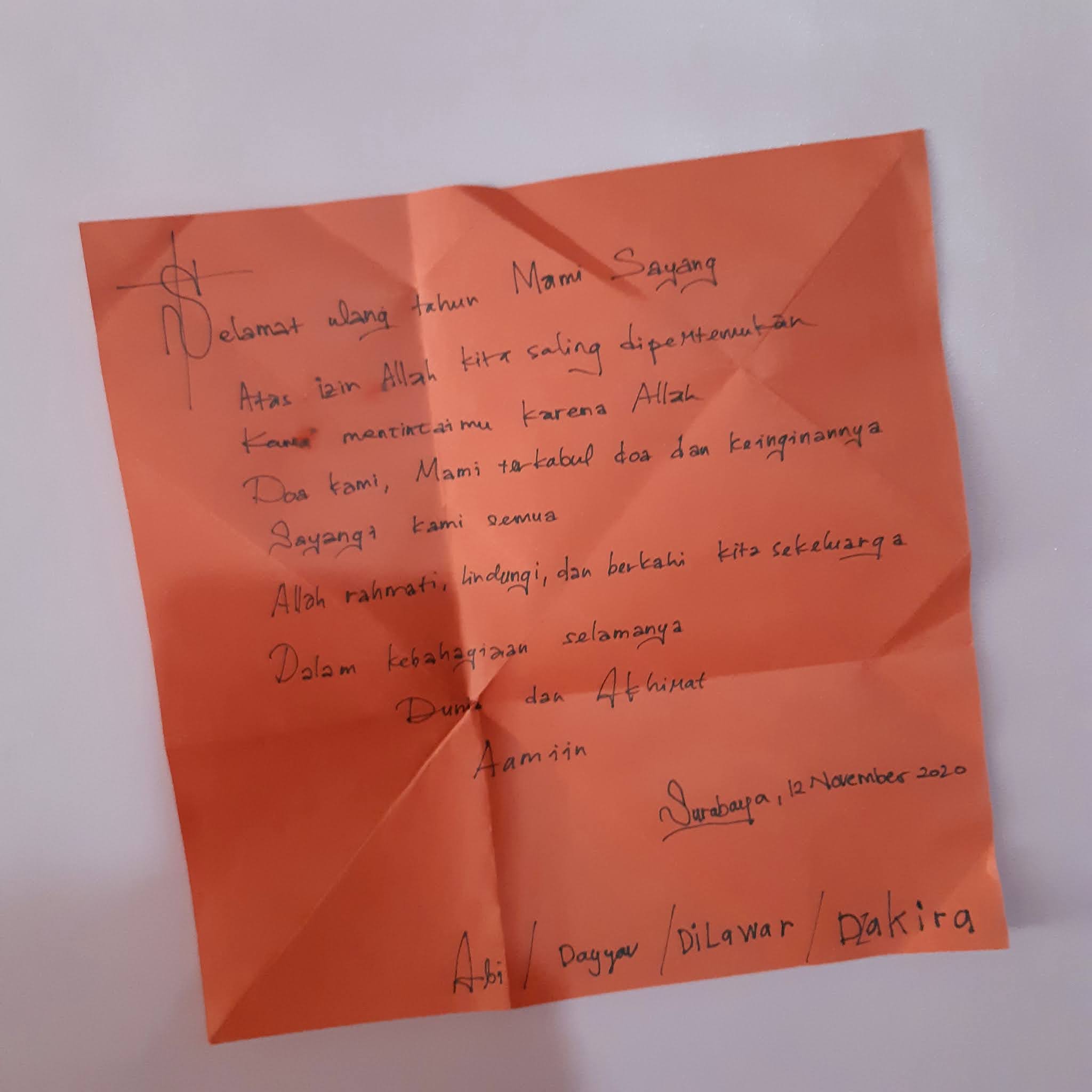 After subuh prayer he hugged me and gave me a prayer. Afterwards, he reads Al Quran as usual, we talked a little, and then he fell asleep. When the kids have woken up they all gathered in our bedroom and handed me the birthday gift with a heartfelt writing on the heart shaped greeting card. I was teary eyed reading the card. We all hugged and took picture, then we went into the usual morning routine: kids were showering, breakfast were prepared, my husband off to work, kids went online schooling, et cetera.
